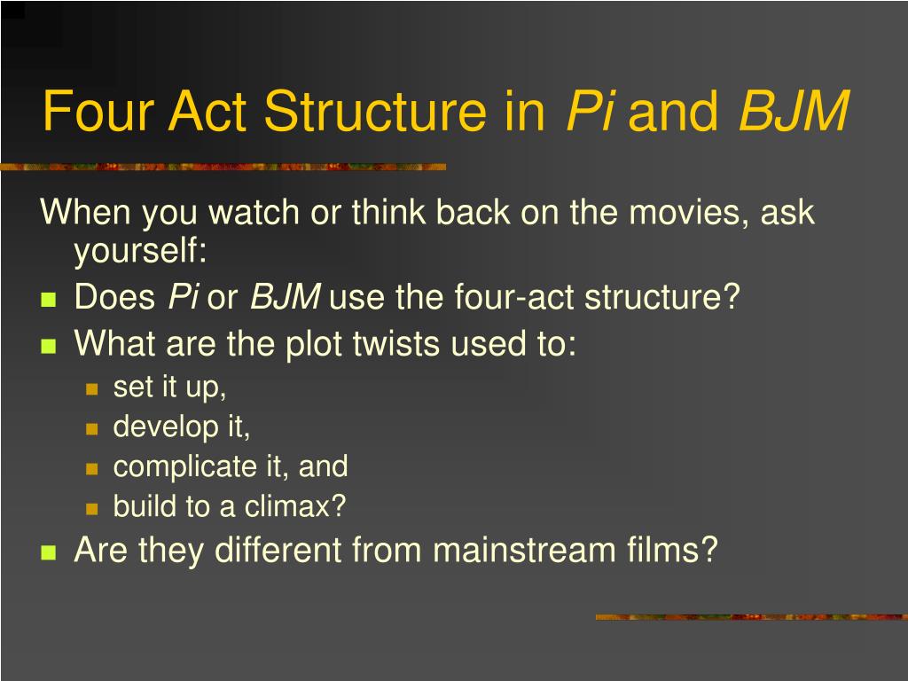 Four Act Structure in Pi and BJM When you watch or think back on the movies, ask yourself: • Does Pi or BJM use the four-act structure? • What are the plot twists used to: • set it up, • develop it, • complicate it, and • build to a climax? • Are they different from mainstream films?