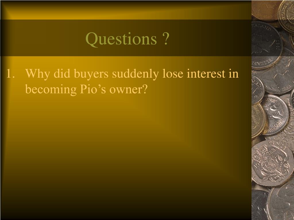 Questions ? • Why did buyers suddenly lose interest in becoming Pio’s owner?