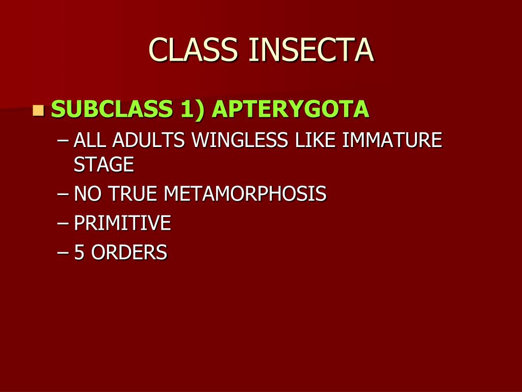 CLASS INSECTA • SUBCLASS 1) APTERYGOTA • ALL ADULTS WINGLESS LIKE IMMATURE STAGE • NO TRUE METAMORPHOSIS • PRIMITIVE • 5 ORDERS