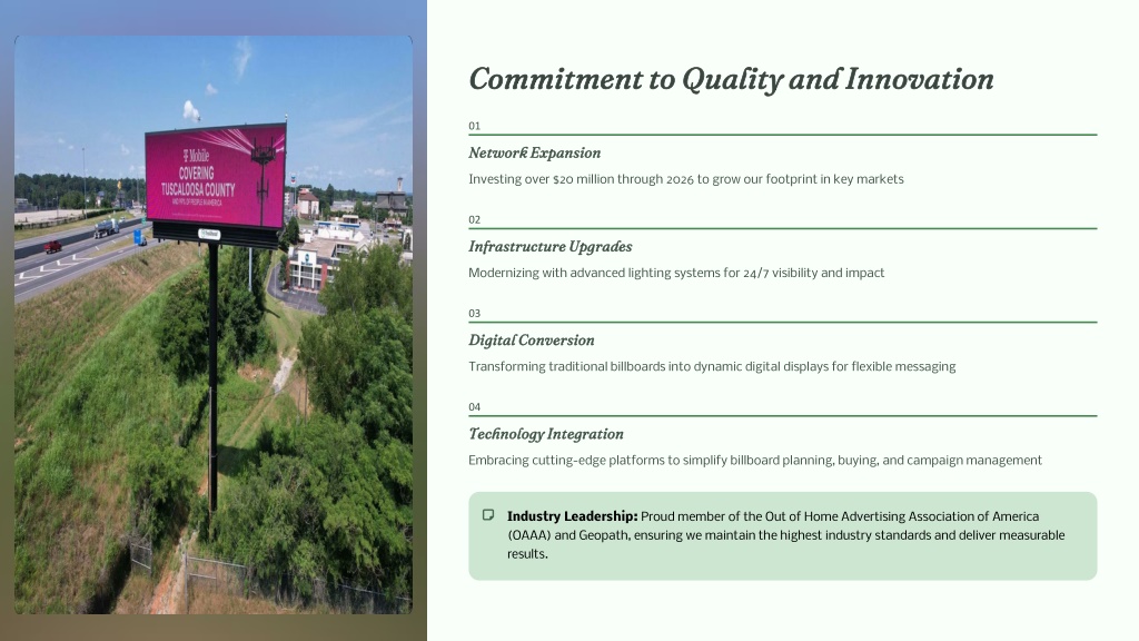 3. Commitment to Quality and Innovation 01 Network Expansion Investing over $20 million through 2026 to grow our footprint in key markets 02 Infrastructure Upgrades Modernizing with advanced lighting systems for 24/7 visibility and impact 03 Digital Conversion Transforming traditional billboards into dynamic digital displays for flexible messaging 04 Technology Integration Embracing cutting-edge platforms to simplify billboard planning, buying, and campaign management Industry Leadership: Proud member of the Out of Home Advertising Association of America (OAAA) and Geopath, ensuring we maintain the highest industry standards and deliver measurable results.