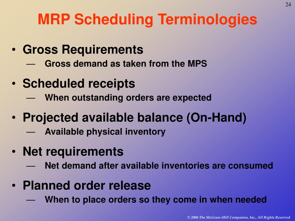 MRP Scheduling Terminologies • Gross Requirements • Gross demand as taken from the MPS • Scheduled receipts • When outstanding orders are expected • Projected available balance (On-Hand) • Available physical inventory • Net requirements • Net demand after available inventories are consumed • Planned order release • When to place orders so they come in when needed