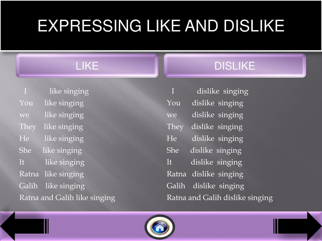 EXPRESSING LIKE AND DISLIKE LIKE DISLIKE I like singing You like singing we like singing They like singing He like singing She like singing It like singing Ratna like singing Galih like singing Ratna and Galih like singing I dislike singing You dislike singing we dislike singing They dislike singing He dislike singing She dislike singing It dislike singing Ratna dislike singing Galih dislike singing Ratna and Galih dislike singing