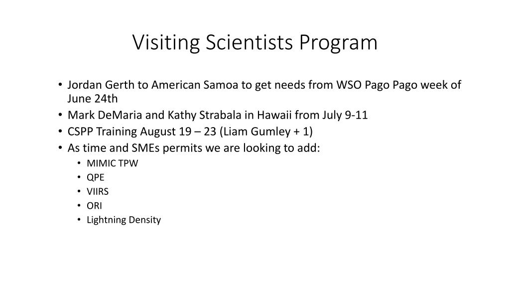 Visiting Scientists Program • Jordan Gerth to American Samoa to get needs from WSO Pago Pago week of June 24th • Mark DeMaria and Kathy Strabala in Hawaii from July 9-11 • CSPP Training August 19 – 23 (Liam Gumley+ 1) • As time and SMEs permits we are looking to add: • MIMIC TPW • QPE • VIIRS • ORI • Lightning Density