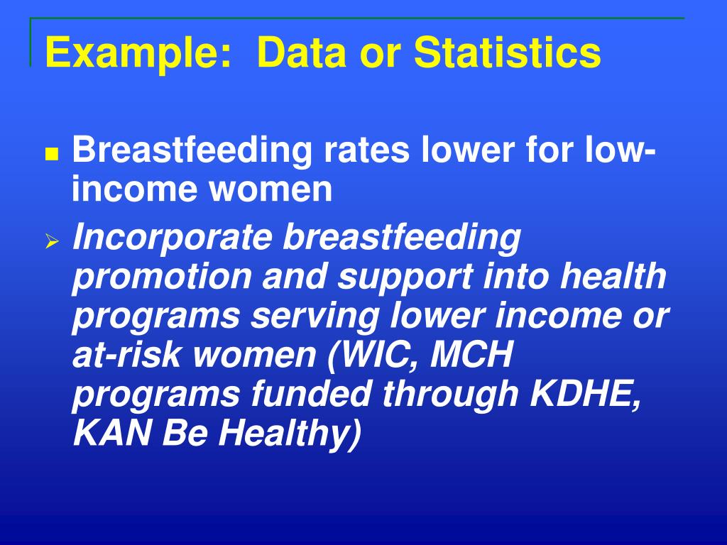 Example: Data or Statistics • Breastfeeding rates lower for low-income women • Incorporate breastfeeding promotion and support into health programs serving lower income or at-risk women (WIC, MCH programs funded through KDHE, KAN Be Healthy)