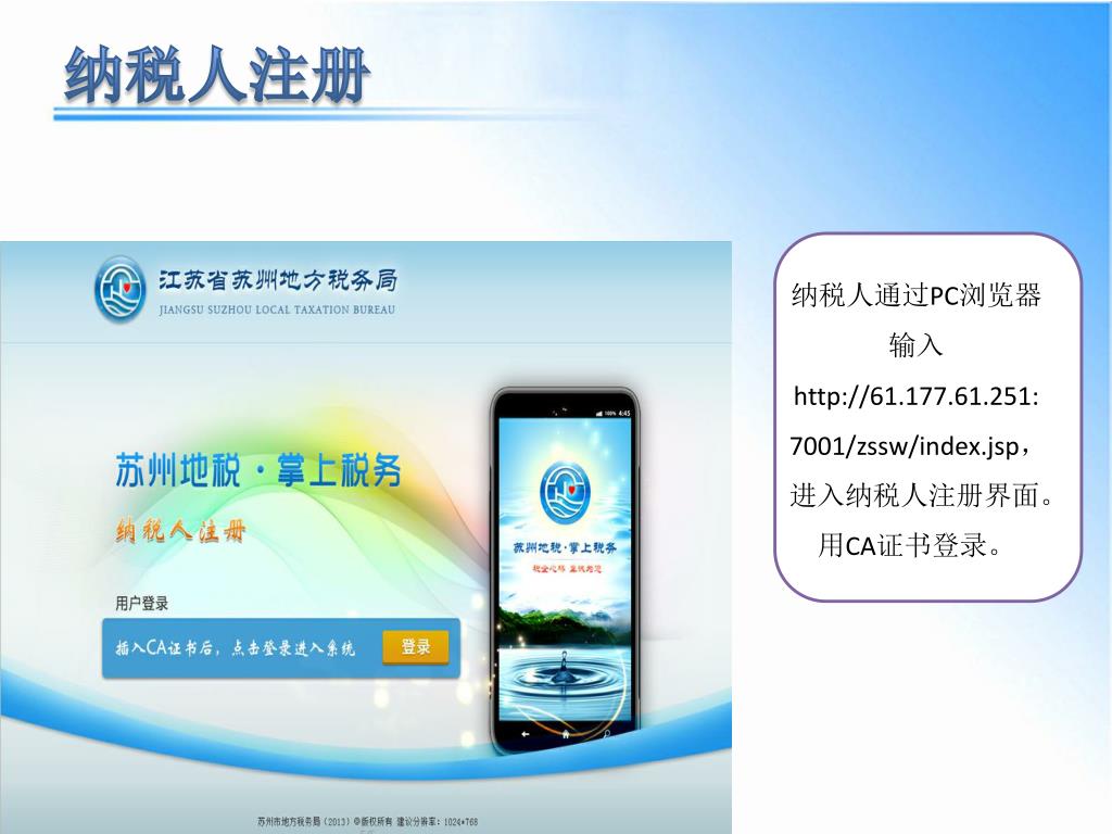 纳税人注册 纳税人通过PC浏览器输入http://61.177.61.251:7001/zssw/index.jsp, 进入纳税人注册界面。用CA证书登录。