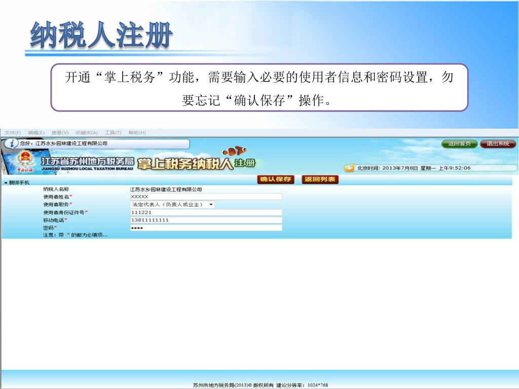 纳税人注册 开通“掌上税务”功能,需要输入必要的使用者信息和密码设置,勿要忘记“确认保存”操作。