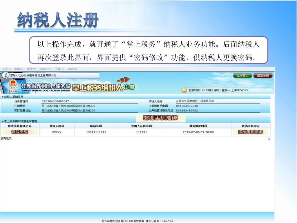 纳税人注册 登录后,会看到自己企业的信息。确认无误后,点击“增加手机捆绑”来开通“掌上税务”业务功能。