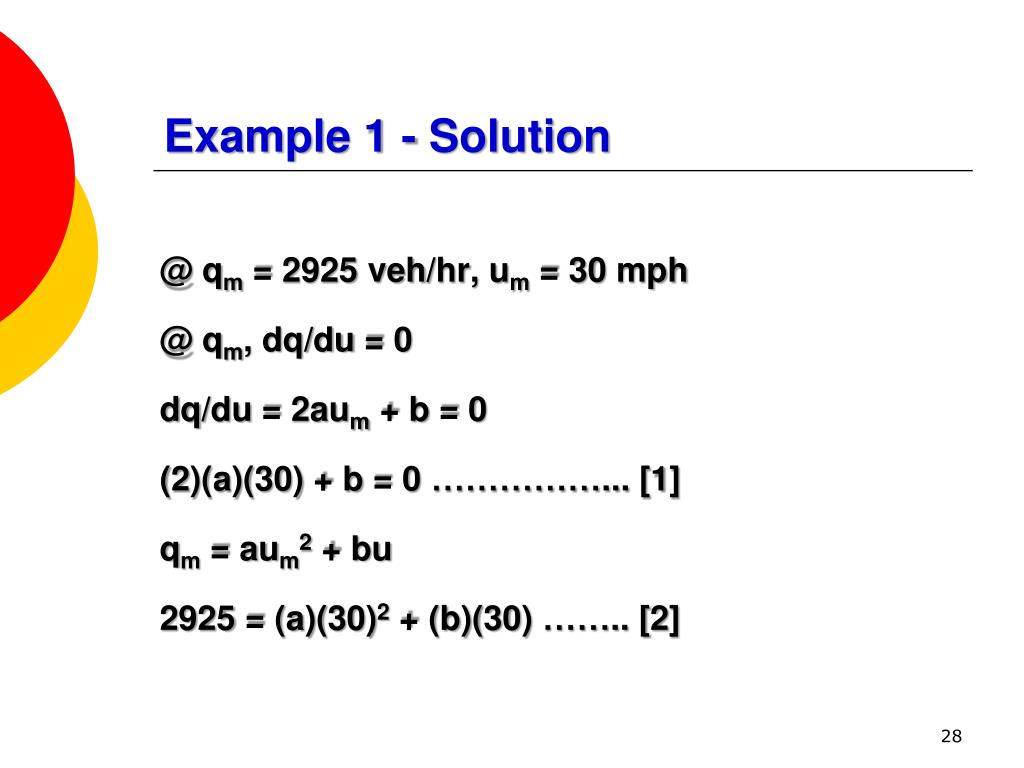 Example 1 - Solution @ qm = 2925 veh/hr, um = 30 mph @ qm, dq/du = 0 dq/du = 2aum + b = 0 (2)(a)(30) + b = 0 ……………... [1] qm = aum2 + bu 2925 = (a)(30)2 + (b)(30) …….. [2]