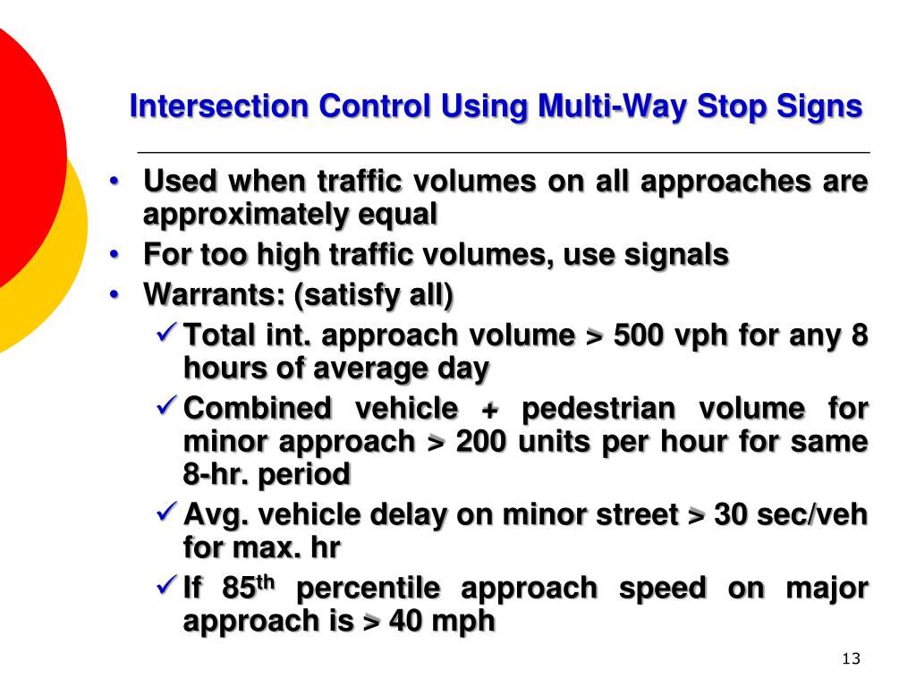 Intersection Control Using Multi-Way Stop Signs • Used when traffic volumes on all approaches are approximately equal • For too high traffic volumes, use signals • Warrants: (satisfy all) • Total int. approach volume > 500 vph for any 8 hours of average day • Combined vehicle + pedestrian volume for minor approach > 200 units per hour for same 8-hr. period • Avg. vehicle delay on minor street > 30 sec/veh for max. hr • If 85th percentile approach speed on major approach is > 40 mph