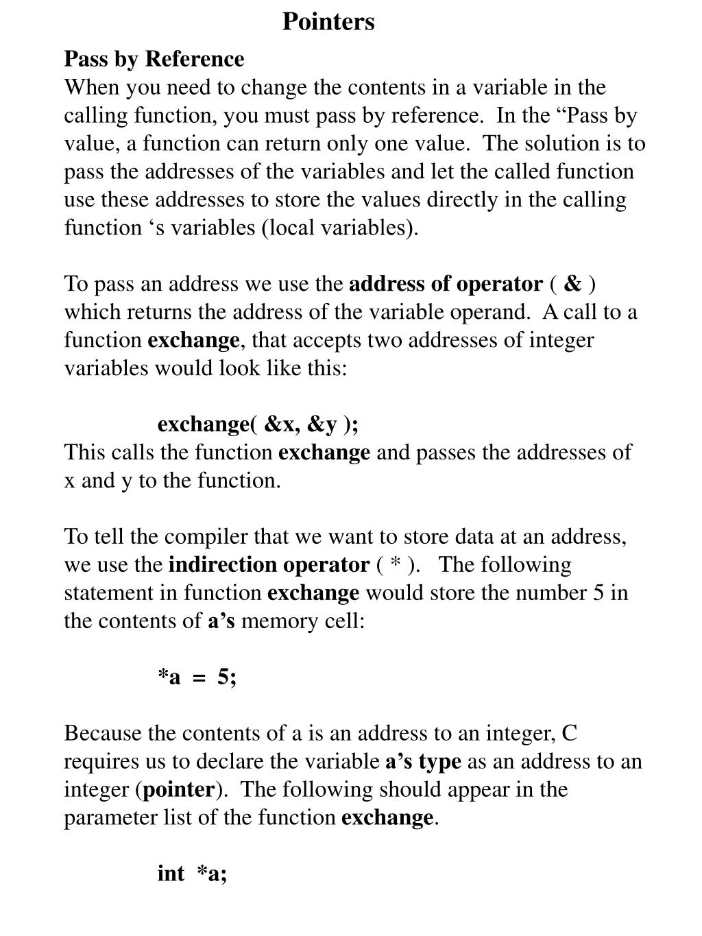 Pointers Pass by Reference When you need to change the contents in a variable in the calling function, you must pass by reference. In the “Pass by value, a function can return only one value. The solution is to pass the addresses of the variables and let the called function use these addresses to store the values directly in the calling function ‘s variables (local variables). To pass an address we use the address of operator ( & ) which returns the address of the variable operand. A call to a function exchange, that accepts two addresses of integer variables would look like this: exchange( &x, &y ); This calls the function exchange and passes the addresses of x and y to the function. To tell the compiler that we want to store data at an address, we use the indirection operator ( * ). The following statement in function exchange would store the number 5 in the contents of a’s memory cell: *a = 5; Because the contents of a is an address to an integer, C requires us to declare the variable a’stype as an address to an integer (pointer). The following should appear in the parameter list of the function exchange. int *a;