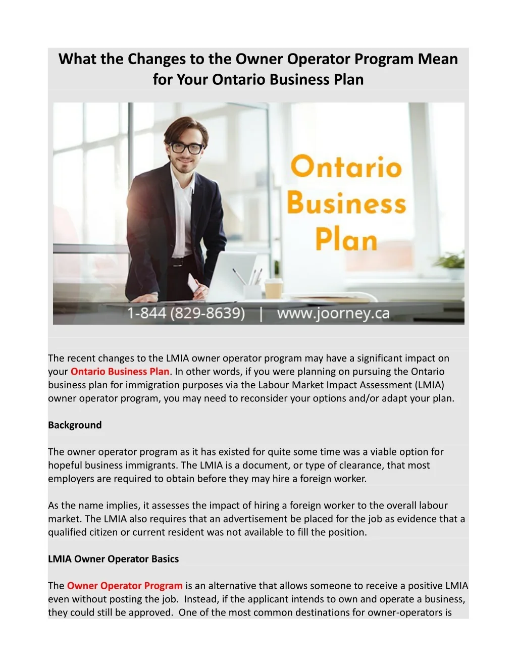 Ontario, therefor these applications would be accompanied by an Ontario business plan. The Changes The changes announced in February 2021 that will take go into effect in April 2021 change the basics of the owner operator program. In essence, it cancels the program by removing the special processing rules and exceptions. Now, owner operators must still place the job advertisement and prove that other citizens or residents are not able to fill the role (in this case owner and manager) that they themselves plan to fill. There are other changes as well. Most notably, the prevailing wage requirement was not applied under the owner operator program. When hiring a foreign worker, employers must pay them within the average wage for the specific job in the given area. Those applying under the LMIA owner operator program were not expected to adhere to this. They would often opt not to pay themselves this wage in order to have more cash flow for general business expenses or to cover other salaries. This is no longer an option, which may make it difficult for those who could still qualify under the new rules. Adapting Your Ontario Business Plan If you have created – or are planning on creating – an Ontario Business Plan as part of an owner operator program, there are a few important things to keep in mind. First and foremost, you may still be able to secure an owner operator program LMIA if you can prove the role can’t be filled by a local. This can be a tall task but, may be achievable if the business you are proposing running is in a high demand field like technology. You may also be able to adapt your Ontario business plan and intended business immigration path to one of several alternatives. These include many exceptions to the LMIA under the International Mobility Program. They include things like Significant Benefit exception or, if you already own your business in your home country, an Intra-Company Transferee. Conclusion Changes to the LMIA Owner Operator Program have fundamentally altered the requirements. Thankfully, several exceptions exist. In any case, if you are going for the program in Ontario, you’ll need an Ontario business plan. This plan can, and should, be adapted to address the specifics of any business immigration path you choose to apply for instead. Make sure to consult professionals to help you decide which immigration plan is best for you considering these changes.