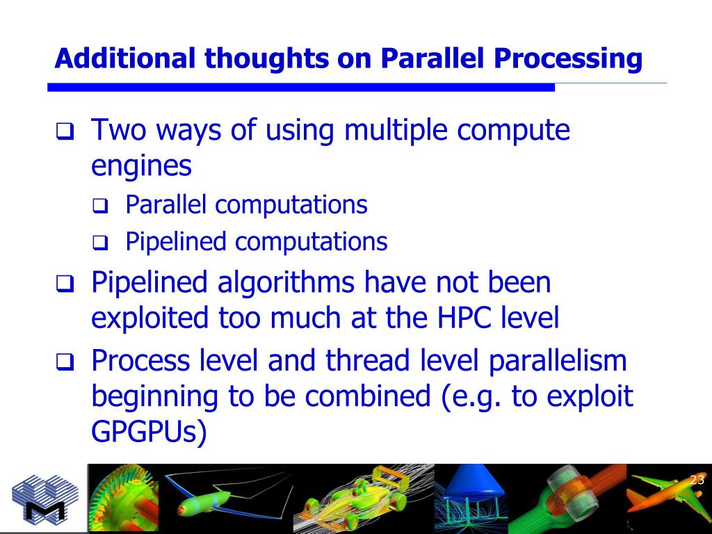 Additional thoughts on Parallel Processing • Two ways of using multiple compute engines • Parallel computations • Pipelined computations • Pipelined algorithms have not been exploited too much at the HPC level • Process level and thread level parallelism beginning to be combined (e.g. to exploit GPGPUs)