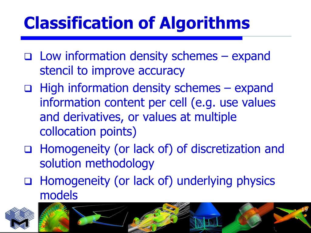 Classification of Algorithms • Low information density schemes – expand stencil to improve accuracy • High information density schemes – expand information content per cell (e.g. use values and derivatives, or values at multiple collocation points) • Homogeneity (or lack of) of discretization and solution methodology • Homogeneity (or lack of) underlying physics models
