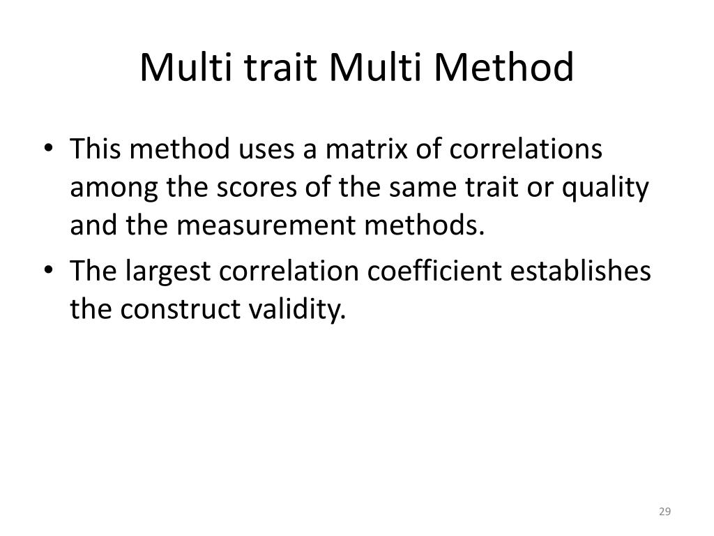 Multi trait Multi Method • This method uses a matrix of correlations among the scores of the same trait or quality and the measurement methods. • The largest correlation coefficient establishes the construct validity.