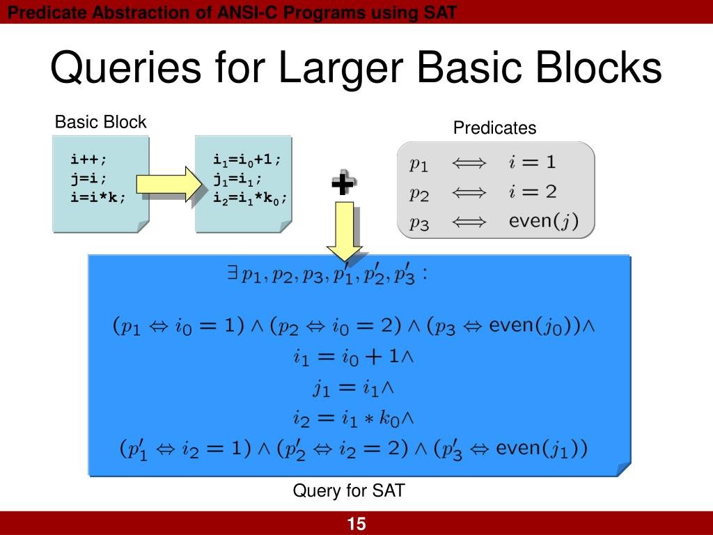 Queries for Larger Basic Blocks Basic Block Predicates i++; j=i; i=i*k; i1=i0+1; j1=i1; i2=i1*k0; + Query for SAT