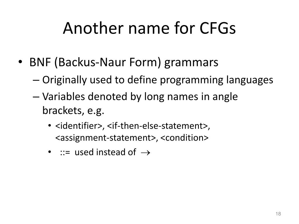 Another name for CFGs • BNF (Backus-Naur Form) grammars • Originally used to define programming languages • Variables denoted by long names in angle brackets, e.g. • <identifier>, <if-then-else-statement>, <assignment-statement>, <condition> • ::= used instead of