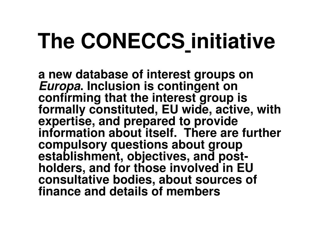 The CONECCSinitiative a new database of interest groups on Europa. Inclusion is contingent on confirming that the interest group is formally constituted, EU wide, active, with expertise, and prepared to provide information about itself. There are further compulsory questions about group establishment, objectives, and post-holders, and for those involved in EU consultative bodies, about sources of finance and details of members