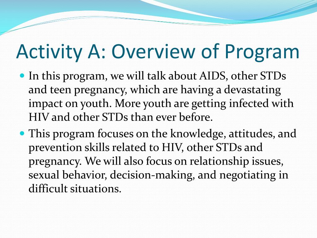 Activity A: Overview of Program • In this program, we will talk about AIDS, other STDs and teen pregnancy, which are having a devastating impact on youth. More youth are getting infected with HIV and other STDs than ever before. • This program focuses on the knowledge, attitudes, and prevention skills related to HIV, other STDs and pregnancy. We will also focus on relationship issues, sexual behavior, decision-making, and negotiating in difficult situations.