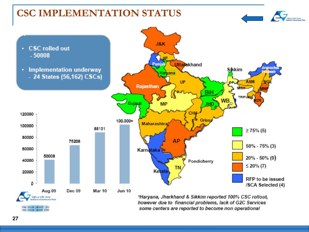 Common Service Centres CSC Infrastructure • 100 – 150 sq. ft space • Minimum 1 PC with UPS • Minimum 1 Printer (Inkjet or Dotmatrix) • Digital / Web Camera • Genset / Inverter/ Solar • OS and other application software • Wired / Wireless Broadband Connectivity • Trained and incentivized manpower Investment : USD 5000 per CSC (Capex) USD 200 per month per CSC (Opex)