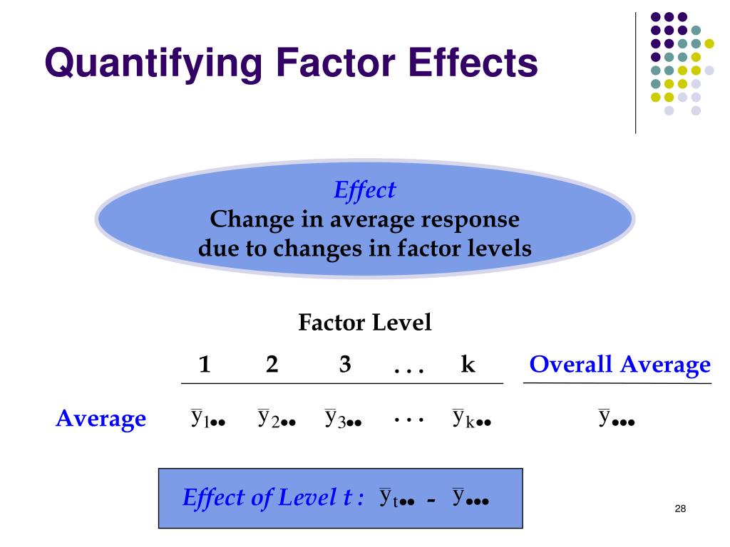 Quantifying Factor Effects Effect Change in average response due to changes in factor levels Factor Level 1 2 3 k Overall Average . . . . . . Average Effect of Level t : -