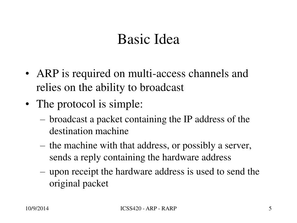 Basic Idea • ARP is required on multi-access channels and relies on the ability to broadcast • The protocol is simple: • broadcast a packet containing the IP address of the destination machine • the machine with that address, or possibly a server, sends a reply containing the hardware address • upon receipt the hardware address is used to send the original packet ICSS420 - ARP - RARP