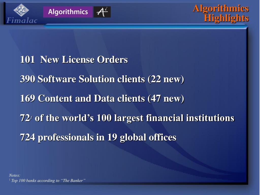 AlgorithmicsHighlights 101 New License Orders 390 Software Solution clients (22 new) 169 Content and Data clients (47 new) 721 of the world’s 100 largest financial institutions 724 professionals in 19 global offices Notes: 1 Top 100 banks according to “The Banker”