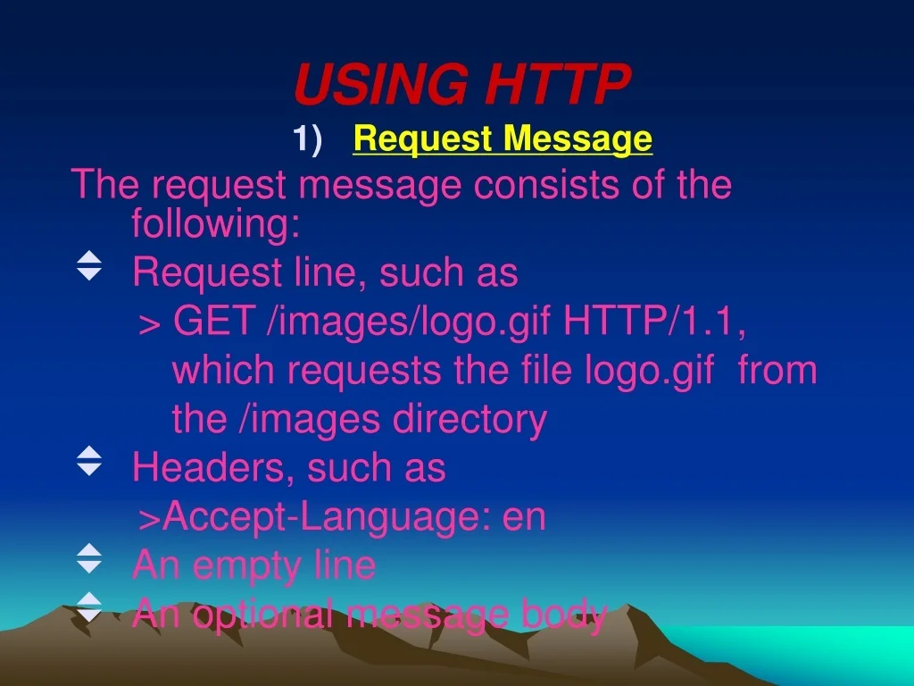 USING HTTP • Request Message The request message consists of the following: • Request line, such as > GET /images/logo.gif HTTP/1.1, which requests the file logo.gif from the /images directory • Headers, such as >Accept-Language: en • An empty line • An optional message body