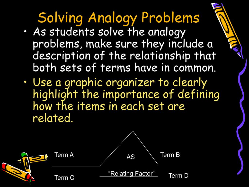 Solving Analogy Problems • As students solve the analogy problems, make sure they include a description of the relationship that both sets of terms have in common. • Use a graphic organizer to clearly highlight the importance of defining how the items in each set are related. Term A Term B AS “Relating Factor” Term D Term C