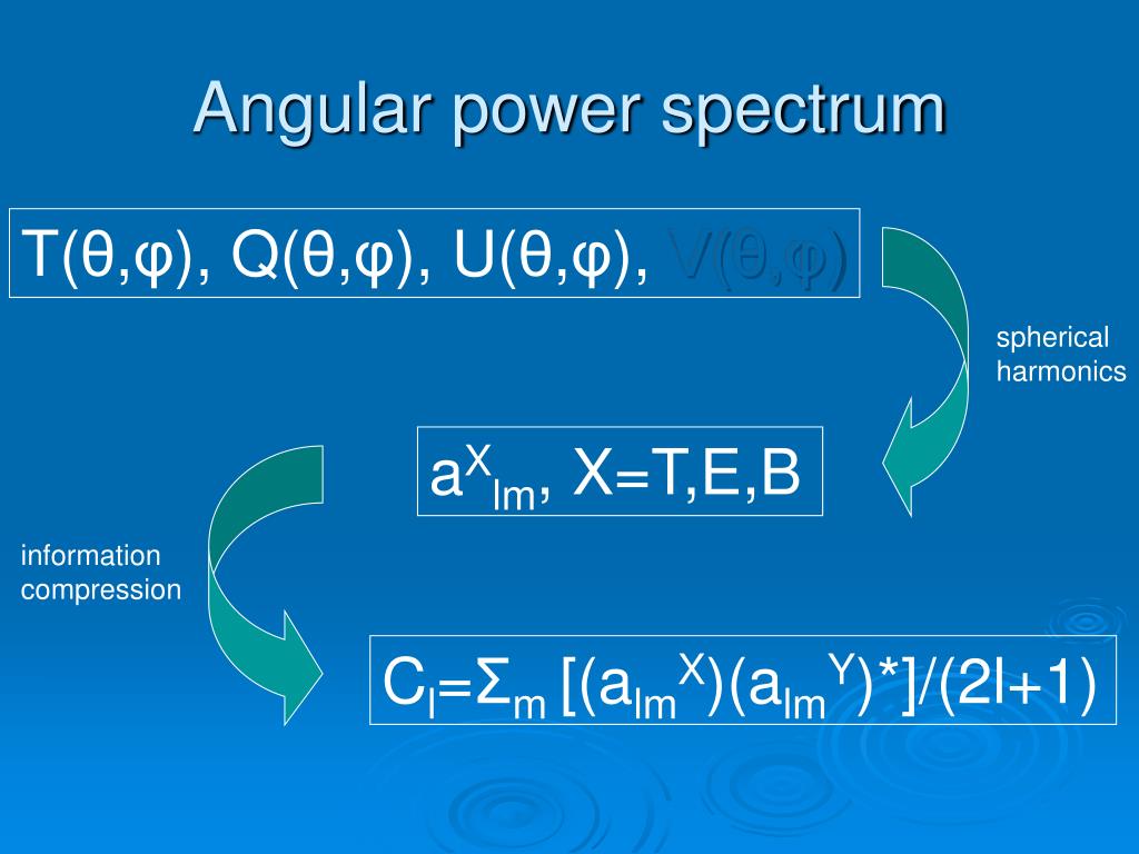 Angular power spectrum T(θ,φ), Q(θ,φ), U(θ,φ), V(θ,φ) spherical harmonics aXlm, X=T,E,B information compression Cl=Σm [(almX)(almY)*]/(2l+1)