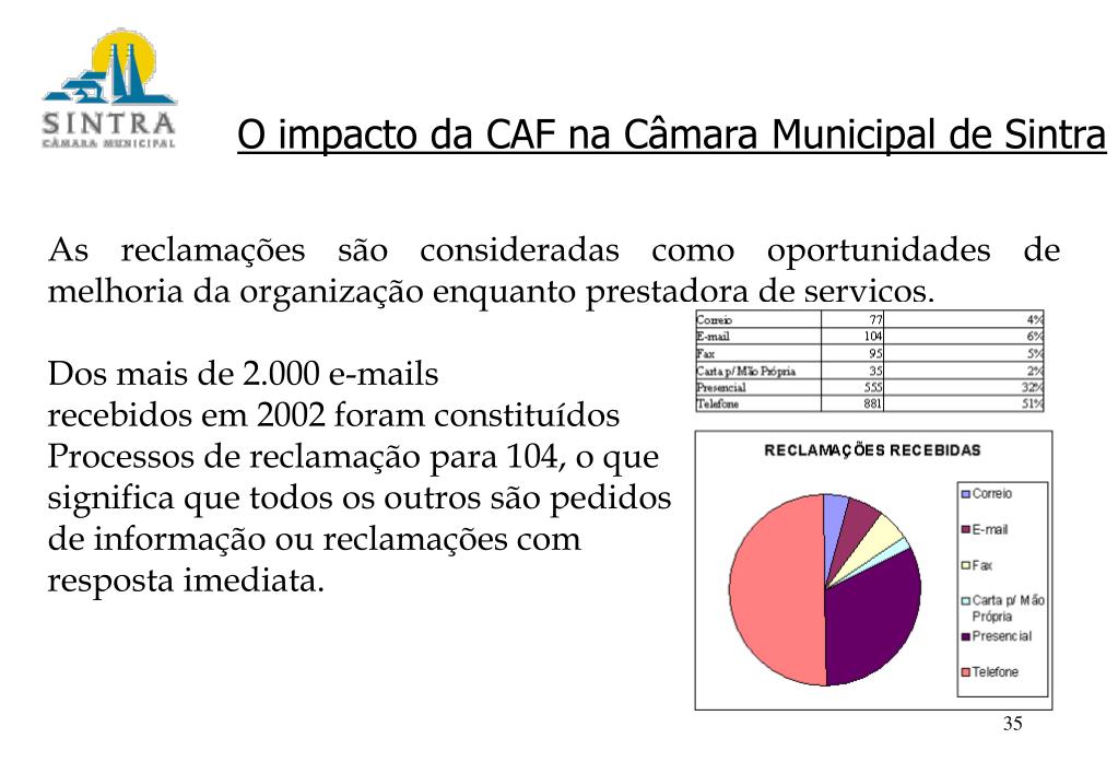 O impacto da CAF na Câmara Municipal de Sintra As reclamações são consideradas como oportunidades de melhoria da organização enquanto prestadora de serviços. Dos mais de 2.000 e-mails recebidos em 2002 foram constituídos Processos de reclamação para 104, o que significa que todos os outros são pedidos de informação ou reclamações com resposta imediata.