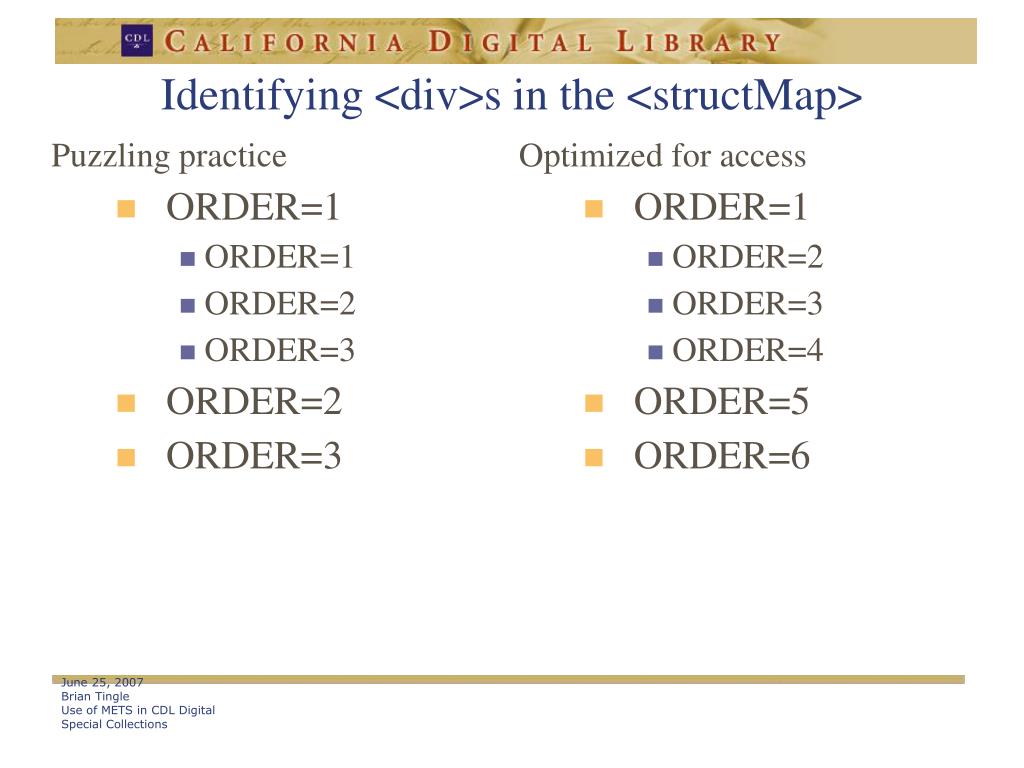 Identifying <div>s in the <structMap> Puzzling practice ORDER=1 ORDER=1 ORDER=2 ORDER=3 ORDER=2 ORDER=3 Optimized for access ORDER=1 ORDER=2 ORDER=3 ORDER=4 ORDER=5 ORDER=6