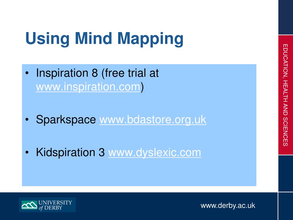 Using Mind Mapping • Inspiration 8 (free trial at www.inspiration.com) • Sparkspace www.bdastore.org.uk • Kidspiration 3 www.dyslexic.com