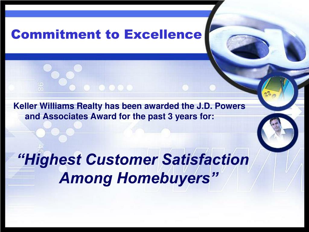 Commitment to Excellence • Keller Williams Realty has been awarded the J.D. Powers and Associates Award for the past 3 years for: • “Highest Customer Satisfaction Among Homebuyers”