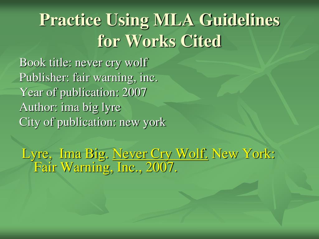 Book title: never cry wolf Publisher: fair warning, inc. Year of publication: 2007 Author: ima big lyre City of publication: new york Lyre, Ima Big. Never Cry Wolf. New York: Fair Warning, Inc., 2007. Practice Using MLA Guidelinesfor Works Cited