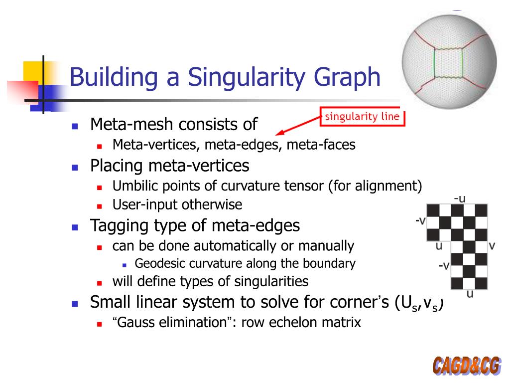Building a Singularity Graph • Meta-mesh consists of • Meta-vertices, meta-edges, meta-faces • Placing meta-vertices • Umbilic points of curvature tensor (for alignment) • User-input otherwise • Tagging type of meta-edges • can be done automatically or manually • Geodesic curvature along the boundary • will define types of singularities • Small linear system to solve for corner’s (Us,Vs) • “Gauss elimination”: row echelon matrix