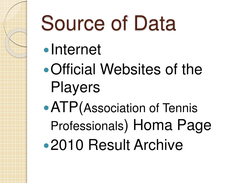 Source of Data • Internet • Official Websites of the Players • ATP(Association of Tennis Professionals) Homa Page • 2010 Result Archive