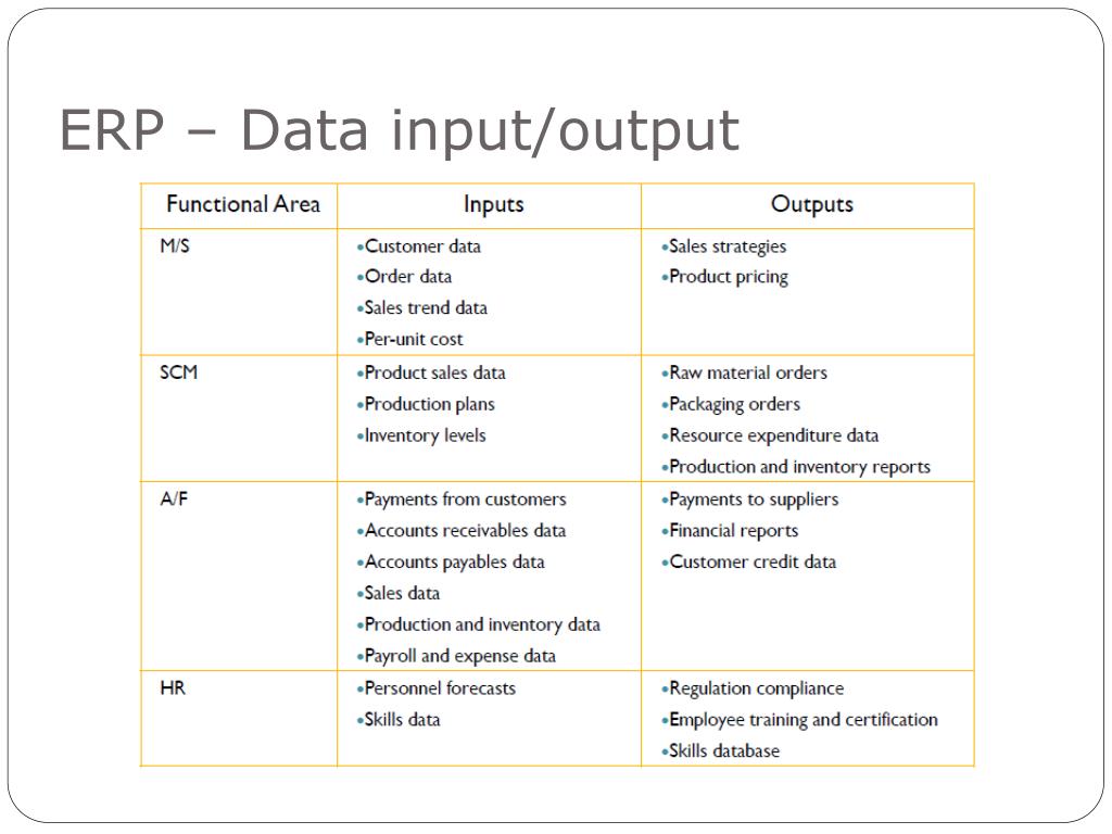 ERP supports business functions – Accounting & Finance • Accounting/Finance • Financial accounting • Cost allocation and control • Planning and budgeting • Cash flow management • Financial analysis