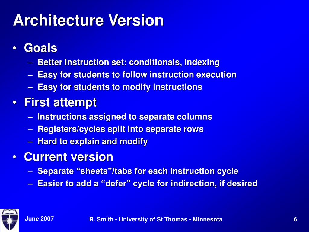 Architecture Version • Goals • Better instruction set: conditionals, indexing • Easy for students to follow instruction execution • Easy for students to modify instructions • First attempt • Instructions assigned to separate columns • Registers/cycles split into separate rows • Hard to explain and modify • Current version • Separate “sheets”/tabs for each instruction cycle • Easier to add a “defer” cycle for indirection, if desired R. Smith - University of St Thomas - Minnesota