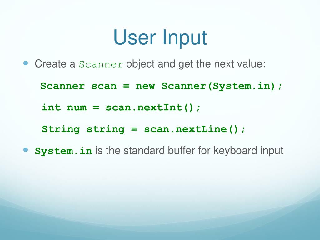 User Input • Create a Scannerobject and get the next value: Scanner scan = new Scanner(System.in); intnum = scan.nextInt(); String string = scan.nextLine(); • System.in is the standard buffer for keyboard input