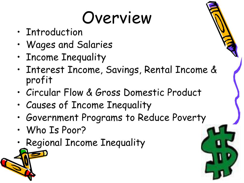 T. Income Distribution. Overview. Introduction Wages and Salaries Income Inequality Interest Income, Savings, Rental Income & profit Circular Flow & Gross Domestic Product Causes of Income Inequality Government Programs to Reduce Poverty Who Is Poor? Regional Income Inequality .