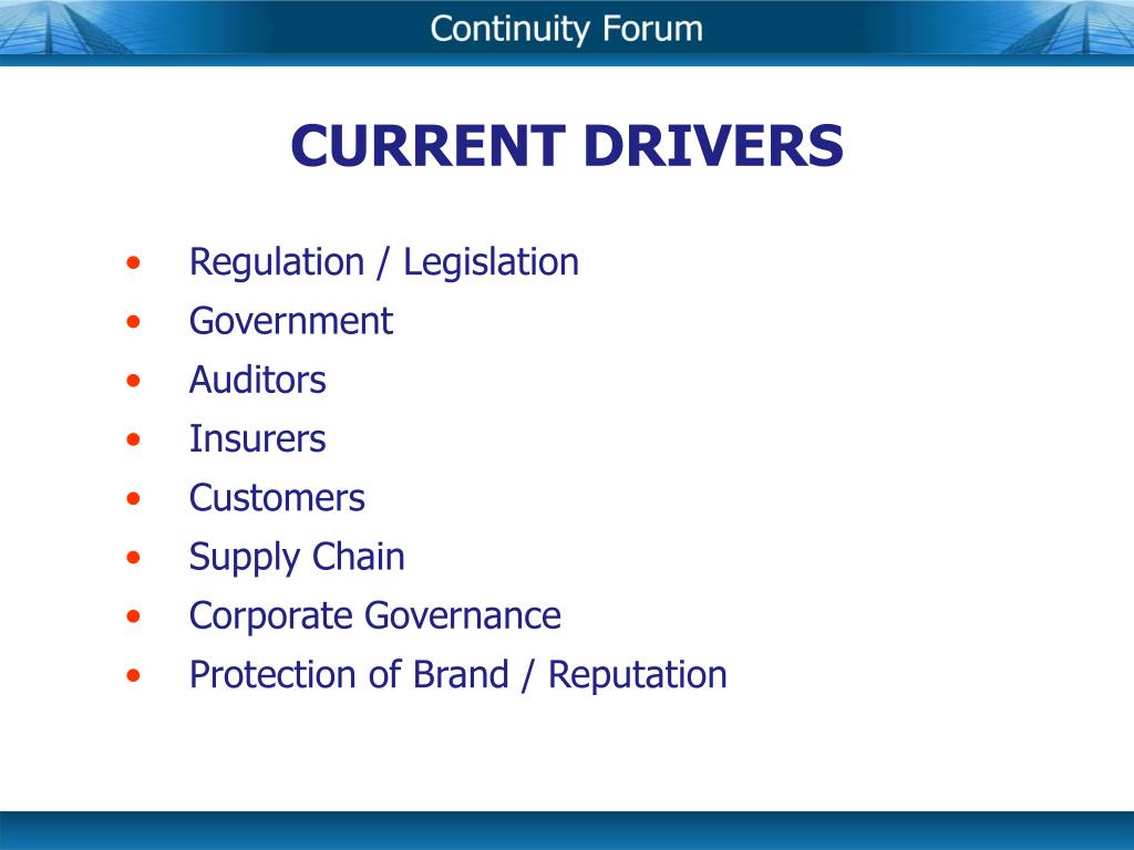 CURRENT DRIVERS • Regulation / Legislation • Government • Auditors • Insurers • Customers • Supply Chain • Corporate Governance • Protection of Brand / Reputation