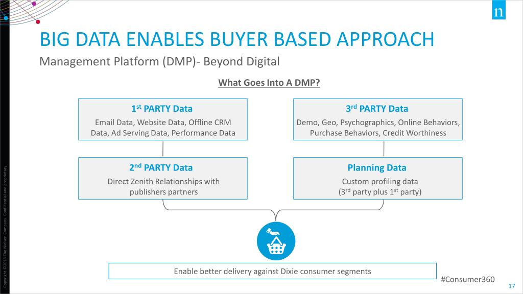 big data enables buyer based approach Management Platform (DMP)- Beyond Digital What Goes Into A DMP? Email Data, Website Data, Offline CRM Data, Ad Serving Data, Performance Data Demo, Geo, Psychographics, Online Behaviors, Purchase Behaviors, Credit Worthiness 2nd PARTY Data 3rd PARTY Data 1st PARTY Data Planning Data Direct Zenith Relationships with publishers partners Custom profiling data (3rd party plus 1st party) Enable better delivery against Dixie consumer segments