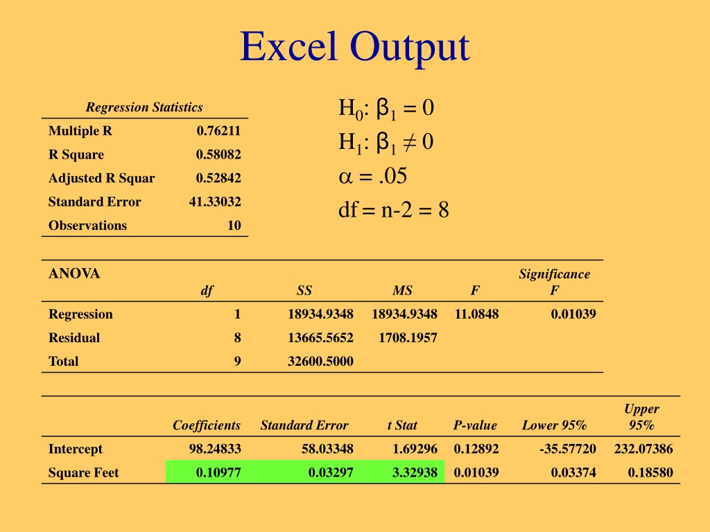 Excel Output H0: β1 = 0 H1: β1 ≠ 0 = .05 df= n-2 = 8