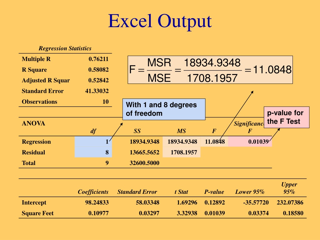 Excel Output With 1 and 8 degrees of freedom p-value for the F Test
