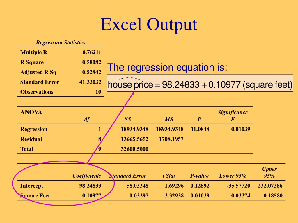Excel Output The regression equation is: