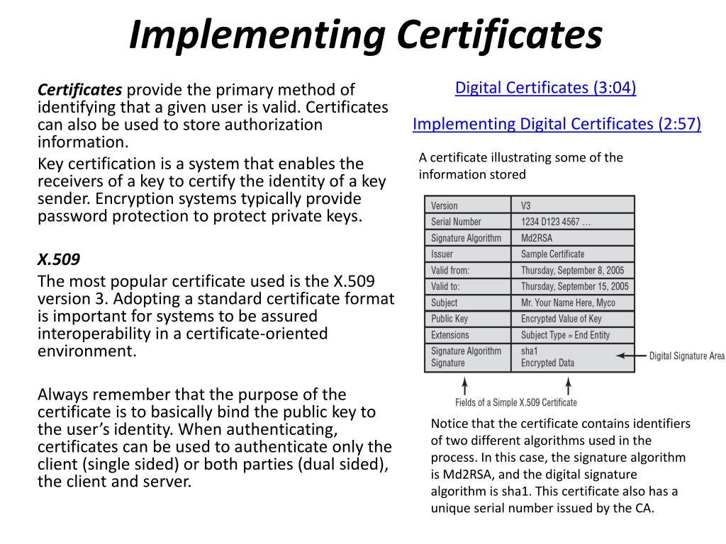 Digital Certificates (3:04) Implementing Digital Certificates (2:57) A certificate illustrating some of the information stored Implementing Certificates Certificates provide the primary method of identifying that a given user is valid. Certificates can also be used to store authorization information. Key certification is a system that enables the receivers of a key to certify the identity of a key sender. Encryption systems typically provide password protection to protect private keys. X.509 The most popular certificate used is the X.509 version 3. Adopting a standard certificate format is important for systems to be assured interoperability in a certificate-oriented environment. Always remember that the purpose of the certificate is to basically bind the public key to the user’s identity. When authenticating, certificates can be used to authenticate only the client (single sided) or both parties (dual sided), the client and server. Notice that the certificate contains identifiers of two different algorithms used in the process. In this case, the signature algorithm is Md2RSA, and the digital signature algorithm is sha1. This certificate also has a unique serial number issued by the CA.