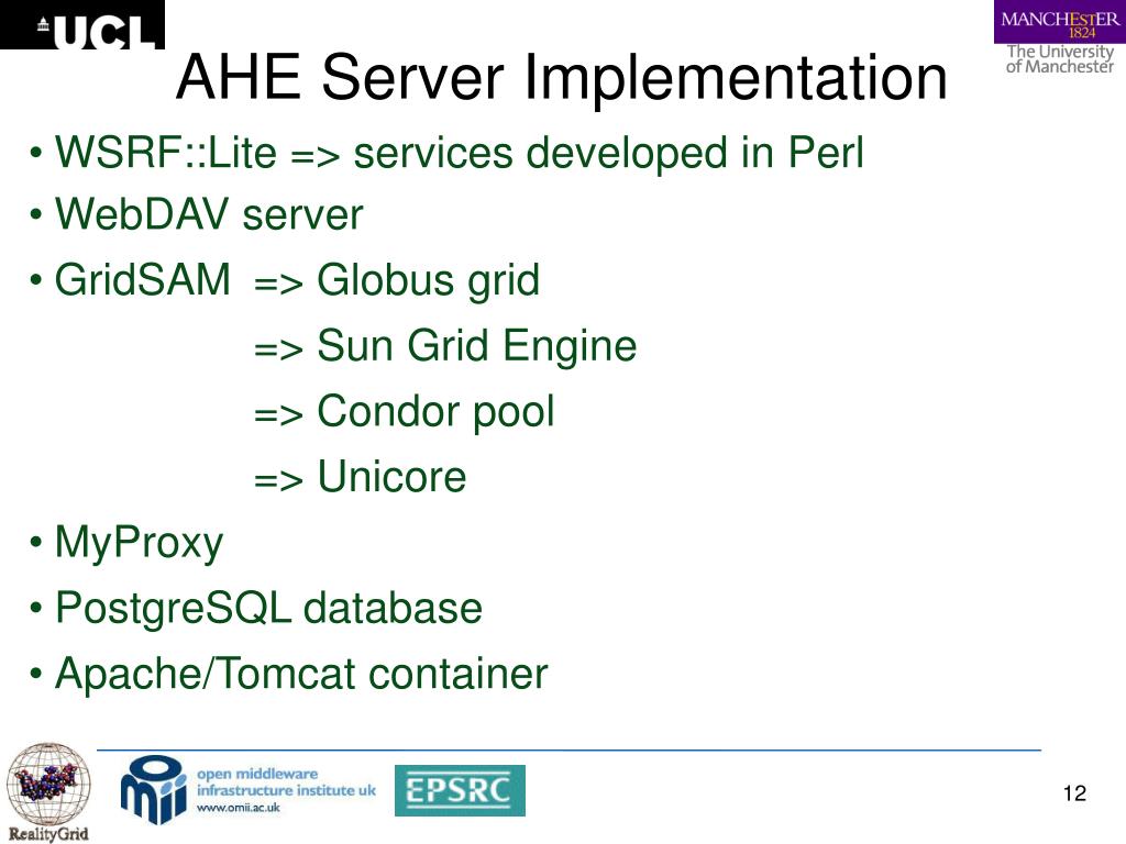 AHE Server Implementation • WSRF::Lite => services developed in Perl • WebDAV server • GridSAM => Globus grid => Sun Grid Engine => Condor pool => Unicore • MyProxy • PostgreSQL database • Apache/Tomcat container