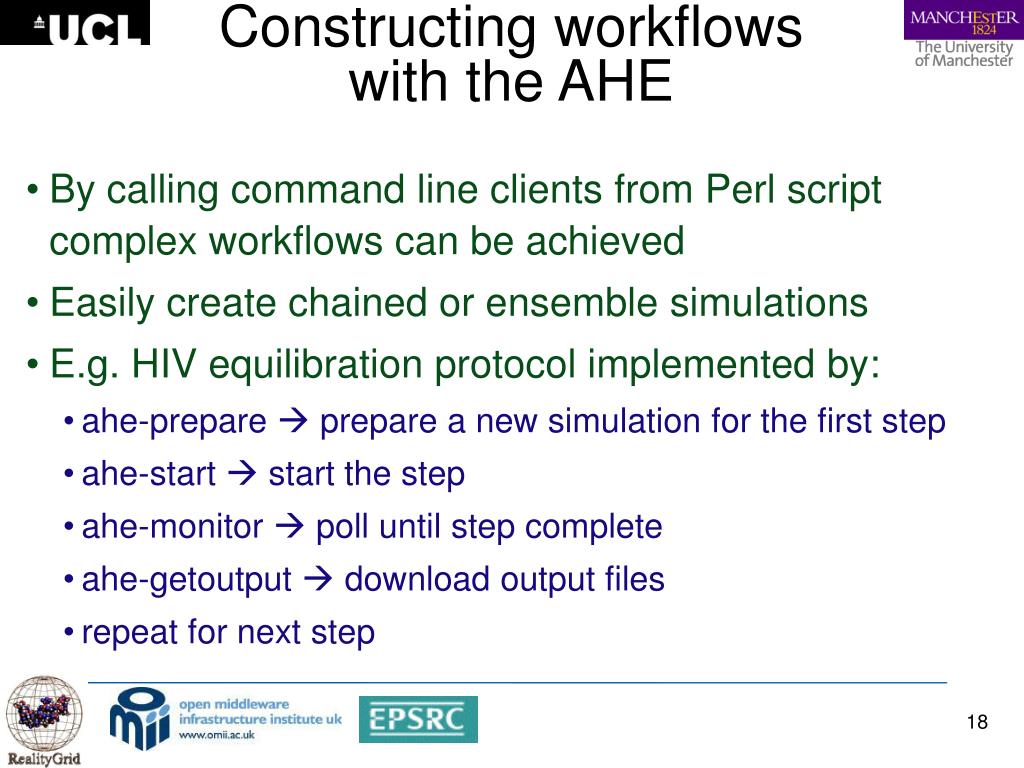 Constructing workflows with the AHE • By calling command line clients from Perl script complex workflows can be achieved • Easily create chained or ensemble simulations • E.g. HIV equilibration protocol implemented by: • ahe-prepare prepare a new simulation for the first step • ahe-start start the step • ahe-monitor poll until step complete • ahe-getoutput download output files • repeat for next step