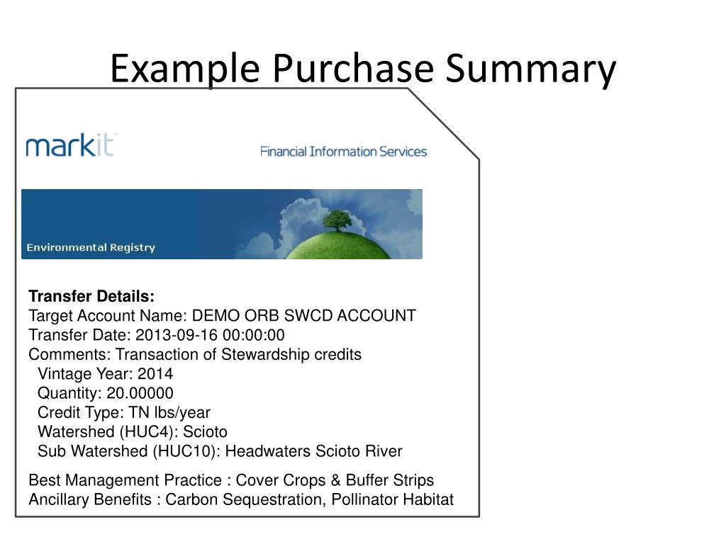 Example Purchase Summary Transfer Details:Target Account Name: DEMO ORB SWCD ACCOUNT Transfer Date: 2013-09-16 00:00:00Comments: Transaction of Stewardship credits Vintage Year: 2014 Quantity: 20.00000 Credit Type: TN lbs/year Watershed (HUC4): Scioto Sub Watershed (HUC10): Headwaters Scioto River Best Management Practice : Cover Crops & Buffer StripsAncillary Benefits : Carbon Sequestration, Pollinator Habitat