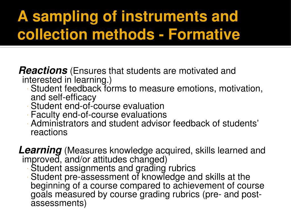 A sampling of instruments and collection methods - Formative Reactions(Ensures that students are motivated and interested in learning.) • Student feedback forms to measure emotions, motivation, and self-efficacy • Student end-of-course evaluation • Faculty end-of-course evaluations • Administrators and student advisor feedback of students’ reactions Learning(Measures knowledge acquired, skills learned and improved, and/or attitudes changed) • Student assignments and grading rubrics • Student pre-assessment of knowledge and skills at the beginning of a course compared to achievement of course goals measured by course grading rubrics (pre- and post-assessments)